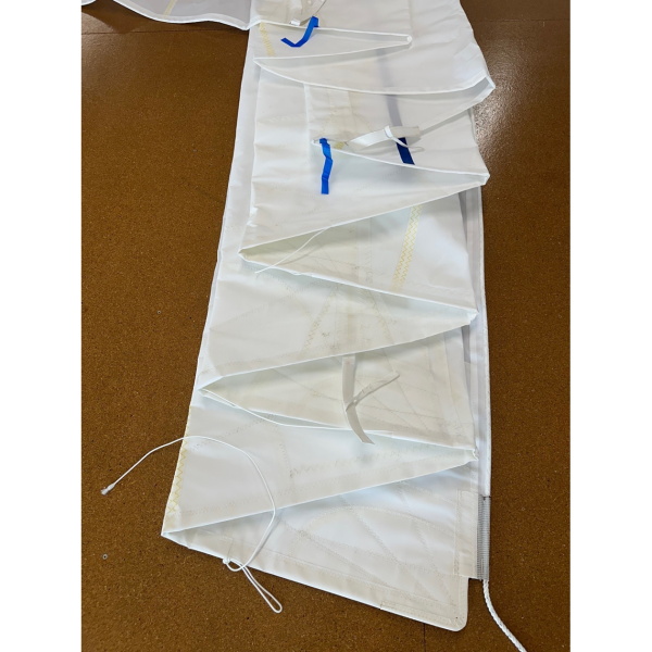 Das Kopfbrett, die Mastrutscher und die Ösen and den Reffs, Hals und Schothorn sind noch nicht im Segel, können dann passend zu Ihrem Rigg verbaut werden. Oberste Segellatte durchgehen und 3 x Kurzlatte.