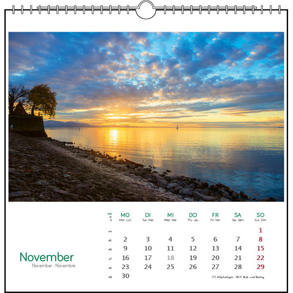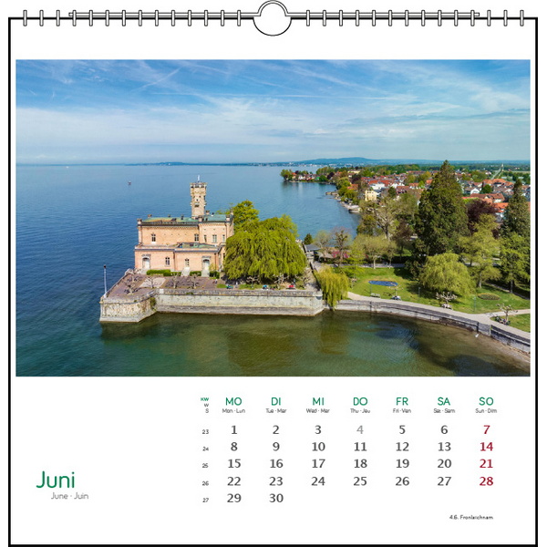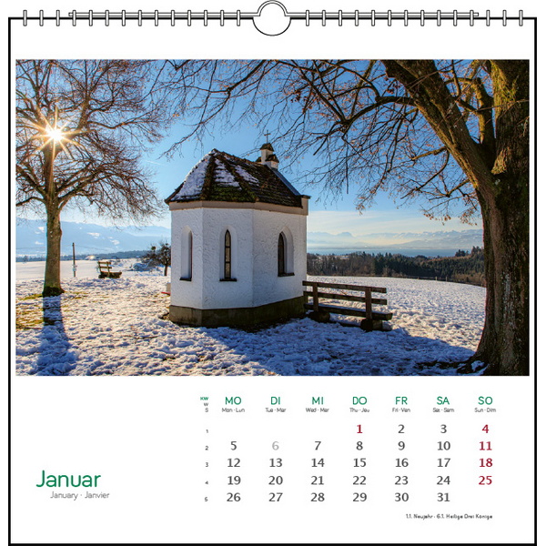 13 wunderschöne Fotografien von Holger Spiering begleiten durch das Jahr. Mit einem Sonnenuntergang über den See vor Litzelstetten beginnt das Jahr und schwenkt über die Mainau und Meersburg, Hegne und Radolfzell bis ins winterliche Lindau. Ob Sonnenuntergang oder die Wolken vor Friedrichshafen oder Unteruhldingen, Holger Spierig findet stets den richtigen Blick auf die schönsten und romantischsten Bilder des Bodensees. Der Zauber der Fotografien liegt in Licht und Farbe in Verbindung mit den Motiven.Holger Spiering, geb. 1967 in Überlingen, führten Studium und Forschungsprojekte nach Nordschweden, Neuseeland, Mittelund Südamerika, Asien und Australien. Aus dem Hobby der Natur- und Landschaftsfotografie wurde bei der Rückkehr an den Bodensee 1997 Beruf, 2005 die Selbstständigkeit als Fotograf (Postkarten, Bildbände). Im Schwerpunkt Panoramafotografie arbeitet er mit zwei Fuji-Mittelformatkameras im seltenen 6x17cm-Format. www.bodenseefotografie.deFotografie: Holger Spiering Format: 48 x 33 cmFeatures: 14 Blatt, Kalendarium/BU 3-sprachig (D/GB/F)Bilder:Titel: Uhldingen-MühlhofenKonstanz-LitzelstettenInsel MainauMeersburgFriedrichshafenUhldingen-MühlhofenÜberlingenInsel ReichenauMarkelfingenHegneRadolfzellKloster BirnauInsel Lindau