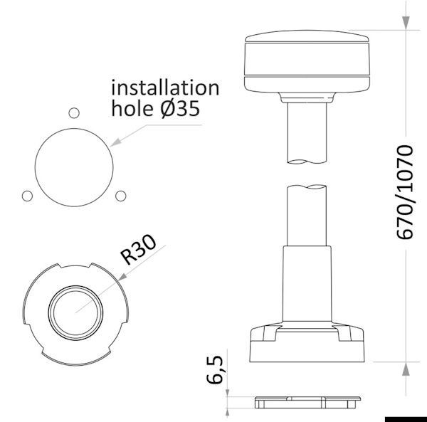 Wird die Leuchte abgenommen und verstaut, ist nur eine kleine flache Scheibe am Deck vorhanden.
