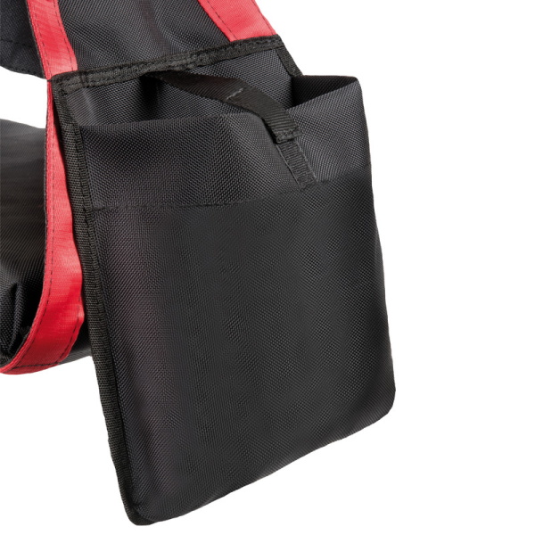 Gebaut aus besonders widerstandsfähigem Nylongewebe. Die Stützbänder sind vollständig umlaufend. Extra großer Sitz mit Polsterung. 2 große Taschen seitlich für Werkzeug und Ersatzteile. Atmungsaktive Stautasche zum Verstauen.