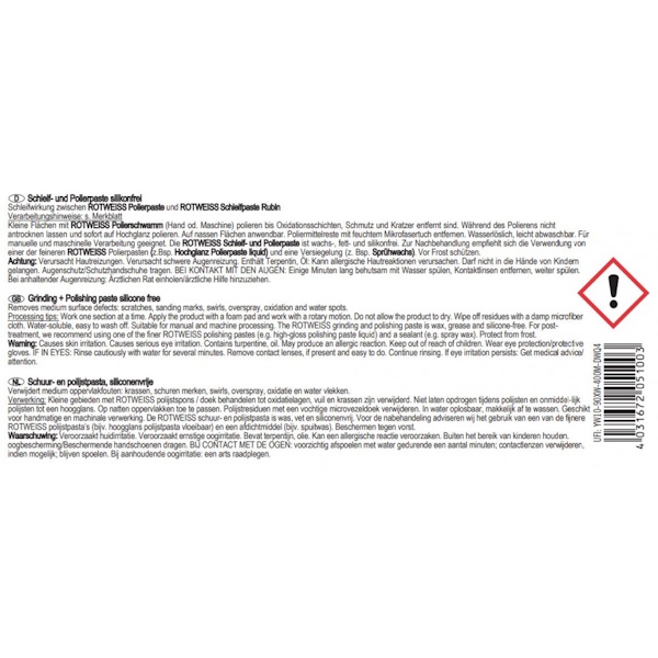 Die Schleif- und Polierpaste ist wachs-, fett- und silikonfrei und somit ideal für anschließende Polier- oder Lackierarbeiten geeignet.