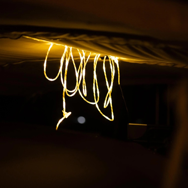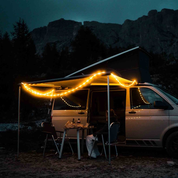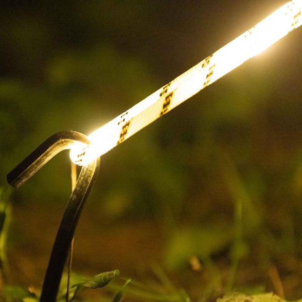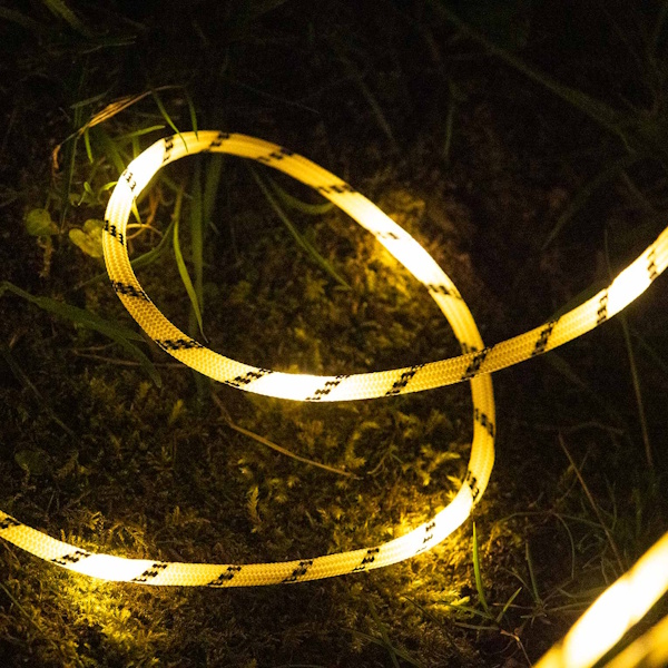 Das Leuchttau ist wetterfest und bringt auch noch Licht ins Dunkel. Das Camplight ist 6m lang und stufenlos am Controller dimmbar.